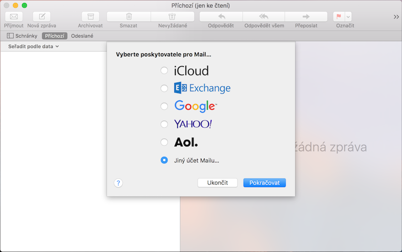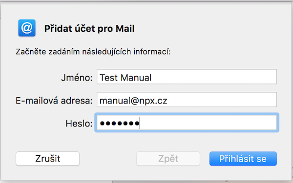 V případě, že OSX Mail již používáte, klikněte vlevo nahoře na „Mail“, poté na „Předvolby“. V nově otevřeném okně vyberte záložku „Účty“ a vlevo dole klikněte pod seznamem účtů na „+“ a pokračujete následujícím bodem.
